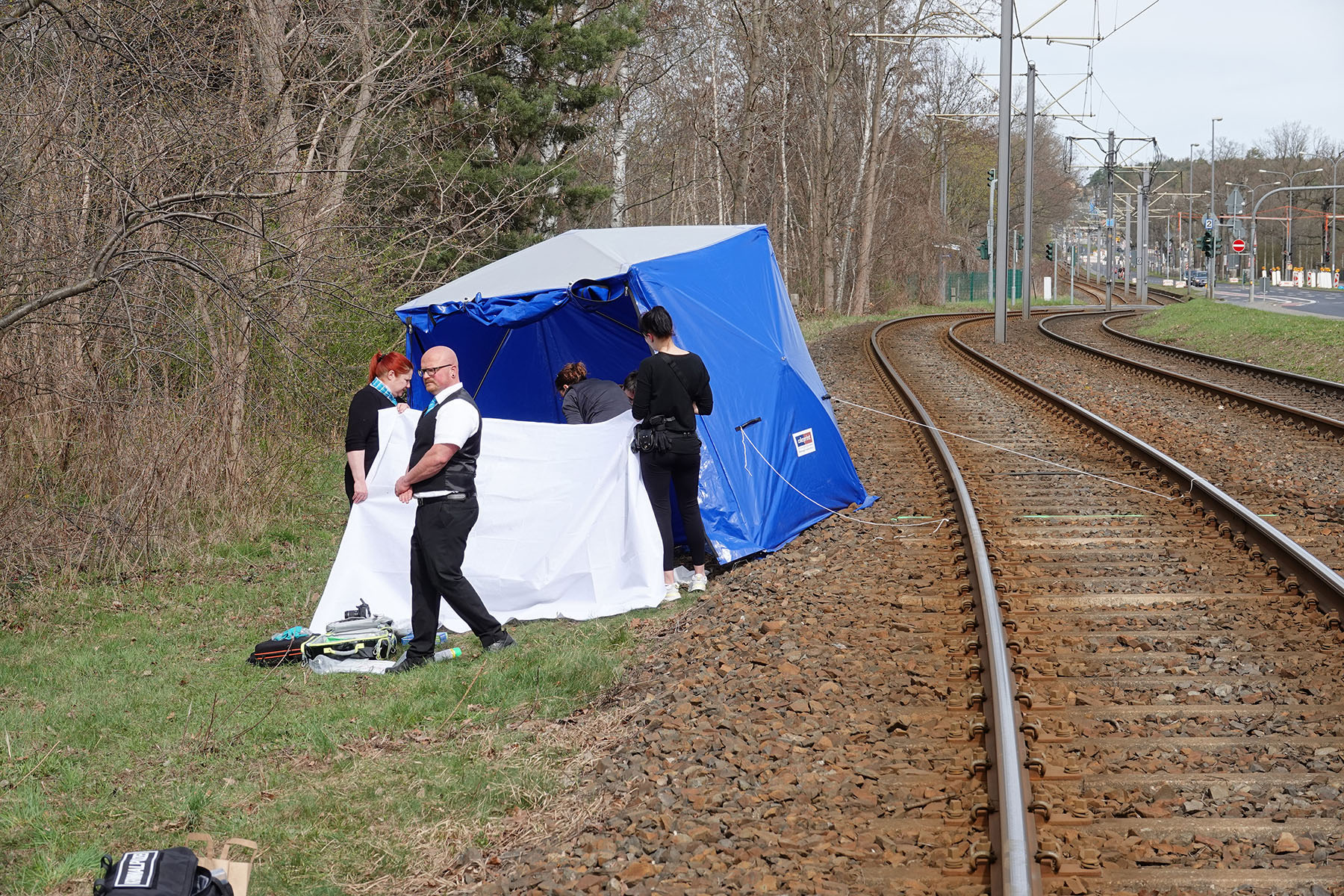 Fotos: Roland Halkasch Kripo ermittelt, Straßenbahnverkehr zwei Linien unterbrochen Ein Toter, der am frühen Morgen des Ostersonntags in Dresden aufgefunden worden war, gibt der Kripo Rätsel auf.. Die Leiche wurde gegen 07.30 Uhr an der Königsbrücker Straße in Höhe der Hellersiedlung neben den Straßenbahngleisen entdeckt. Der Tramverkehr auf zwei Linien wurde etwa sechs Stunden (...weiterlesen)