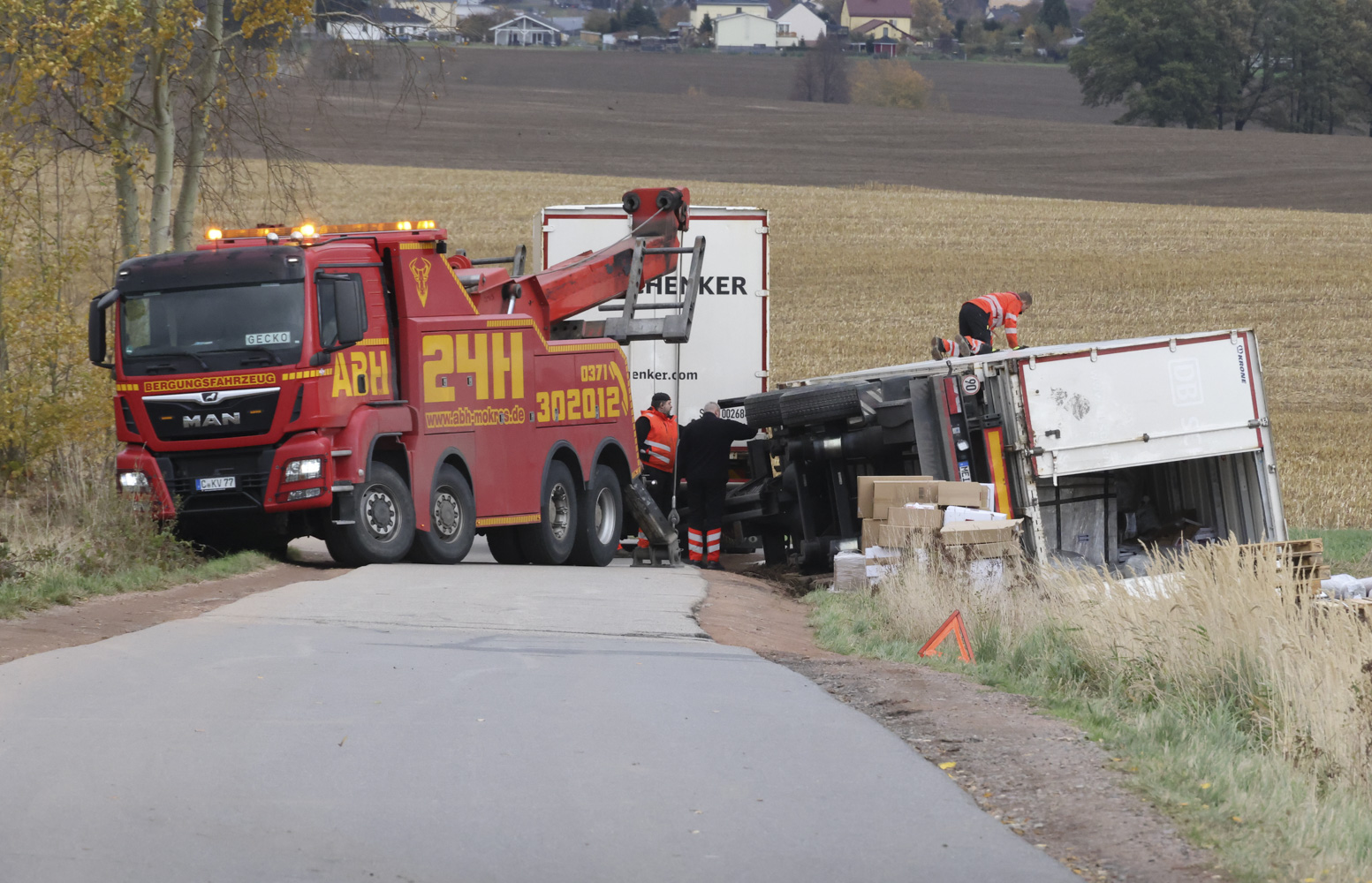 Oberlichtenau: Lkw-Crash - Hänger stürzt um